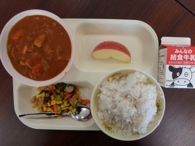 麦ご飯・牛乳・チキンカレー・カラフルソテー・りんご