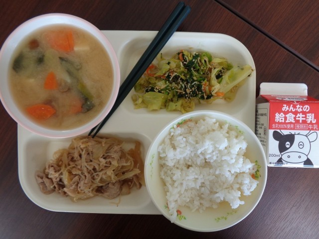 ご飯・牛乳・豚丼の具・じゃこと野菜の和え物・なめこの味噌汁