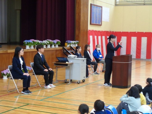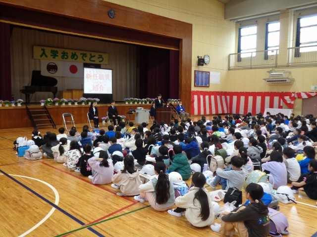 校歌が体育館いっぱいに響いています。新任式では、新たに赴任された6人の先生方の紹介とご挨拶がありました。