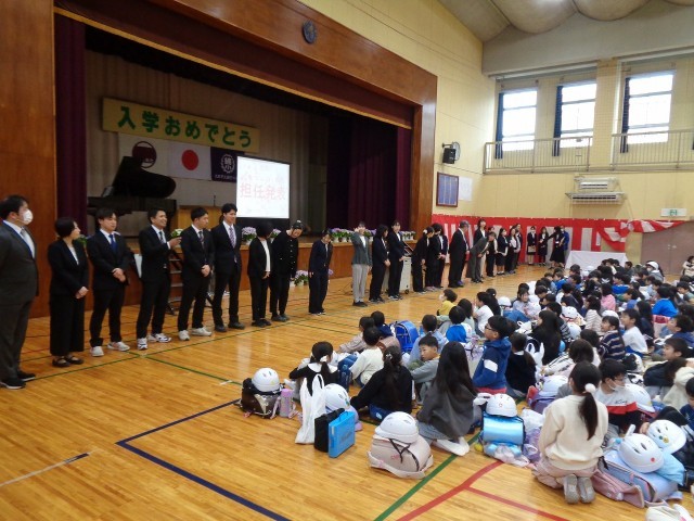 担任発表では、先生方に一列にならんでもらい、学年や教科、担当ごとに発表をしました。総勢38人の先生方が綿打小学校の子どもたちをサポートしていきます。