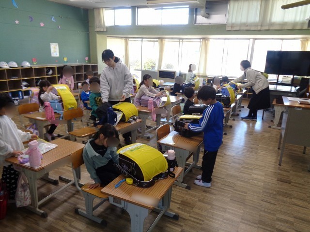 登校した1年生は、ランドセルの中のものや荷物の整理をしています。みんな自分の力で上手にできているようです。