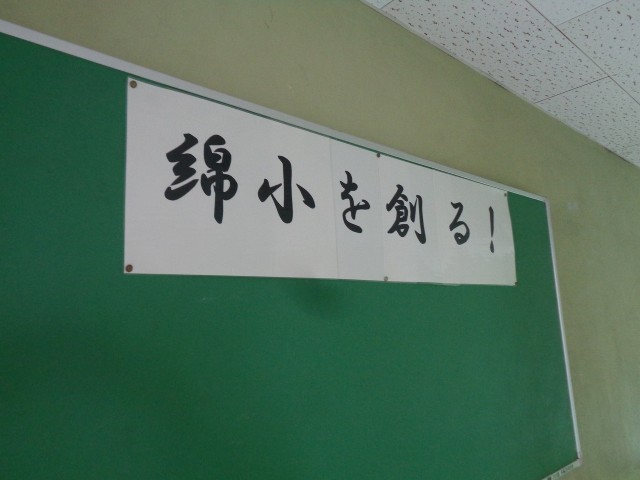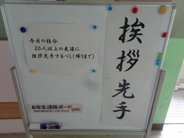 6年生のフロアには「綿小を創る!」の文字がかがげられ、「挨拶先手」のミッションも書かれています。