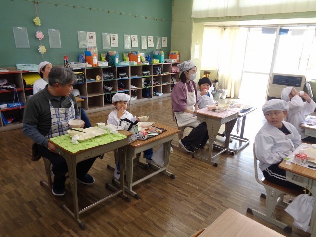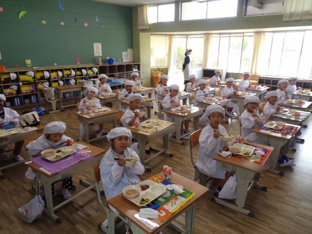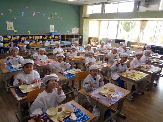 今日から1年生も給食がスタートしました! 白衣に身を包み、みんなでおいしい顔をしてくれました。