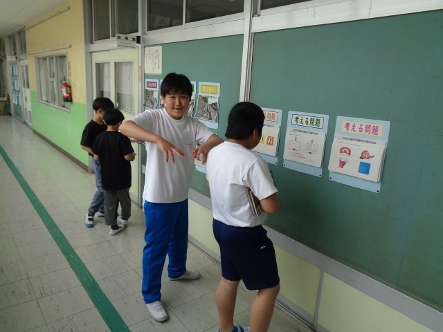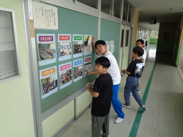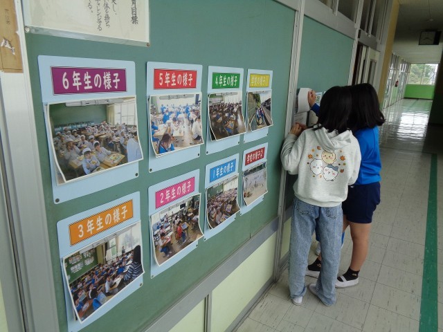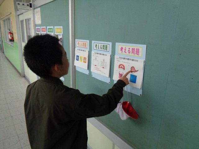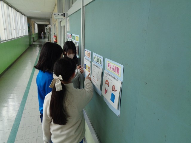 校長室の廊下の壁には、学年や学校の様子を撮った写真を掲示しています。また、昨年度に引き続き、「考える問題」も毎日3題ずつ更新しています。