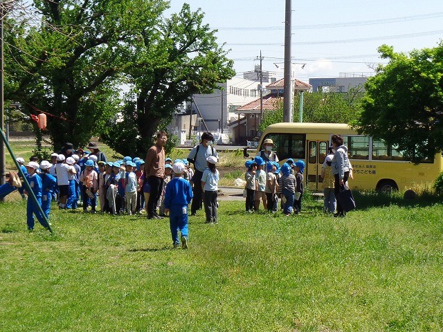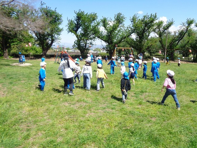 そして、今日は、わたうちこども園とわたっこの年長さんといっしょに、天沼公園で楽しく遊ぶ時間もつくりました。最初はお互いに少し緊張気味でしたが、青空の下、いっしょに活動をしていくうちにみんな仲良し、元気に遊ぶことができました。