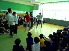 校庭でドッジボールをしたり、教室でジェスチャーゲームをしたり、