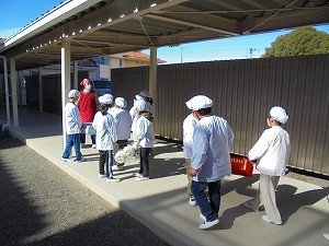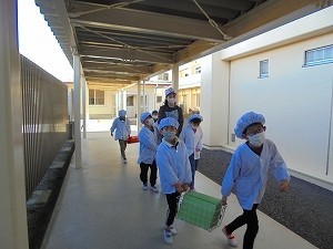2年生が、給食を給食室まで取りに行く練習を始めました。