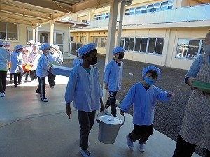 当番の子どもたちは、こぼさないように気をつけて、協力して運んでいました。