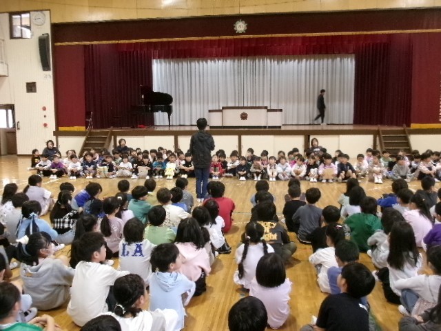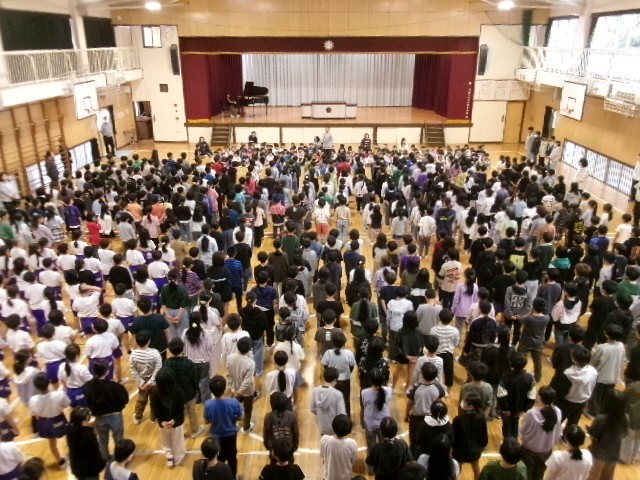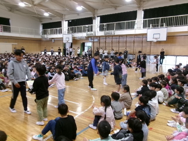 4月15日(水) 朝行事の時間に、体育館で今年度初めて全校児童が集まって、1年生を迎える会を開きました。