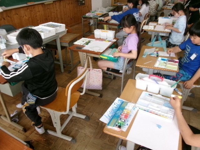 4月17日(金) 4-4では、図画工作の授業で「絵の具を使って夢もよう」という学習をしていました。