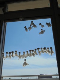 6年生が出発した後、教室をのぞくと、ベランダ側のドアにたくさんのてるてる坊主が。...