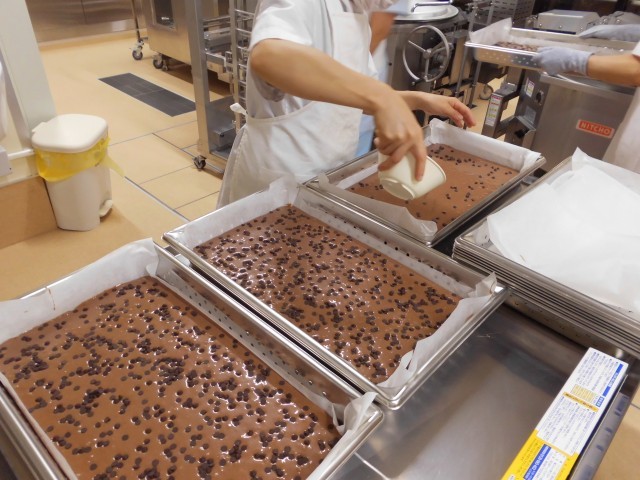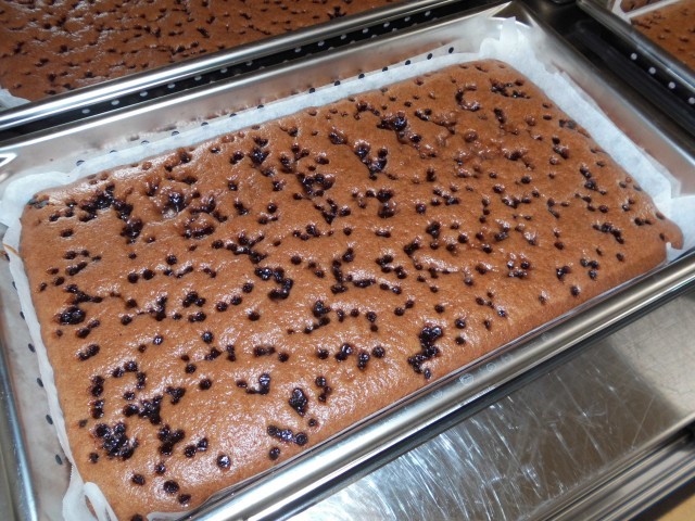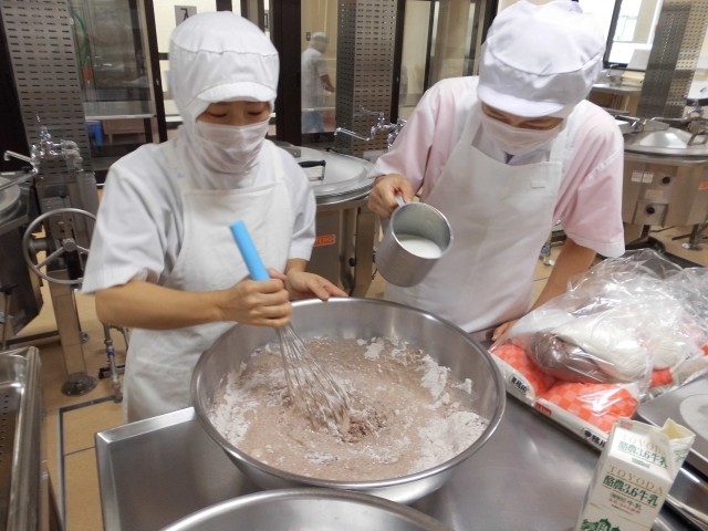 作り方は、まずは、きじ作りです。薄力粉にココアパウダーや牛乳等を入れてふんわりもっちりとした食感になるように混ぜます。次にチョコチップをちりばめます。そして、スチームコンベクションオーブンで蒸します。仕上げは、ふかふかに蒸し上がった蒸しパンを切り分けて配膳します。