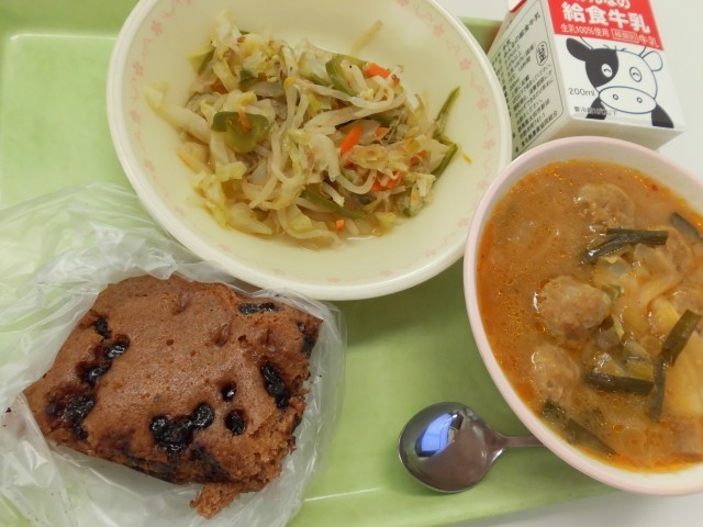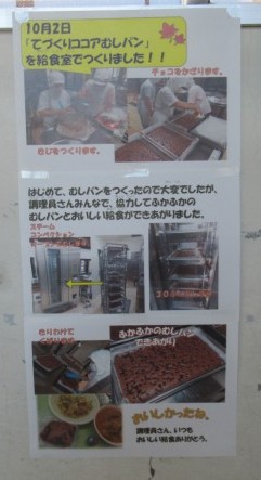本日10月2日の給食は、「手作りココア蒸しパン・味噌ワンタンスープ・おかかいため・牛乳」でした。なかでも、初めて手作り蒸しパンが給食に出たので、子供たちは大喜びでした。