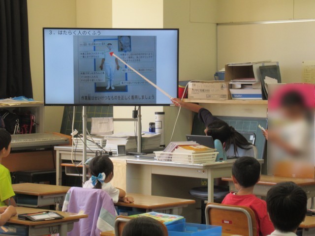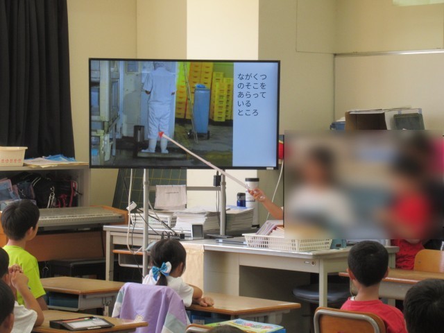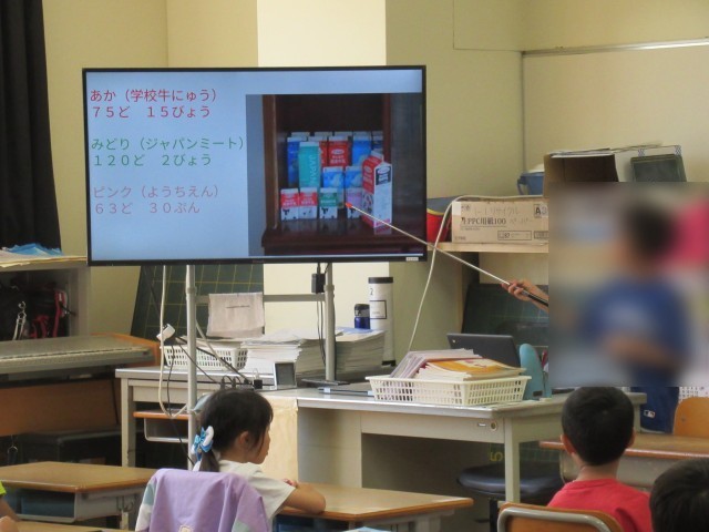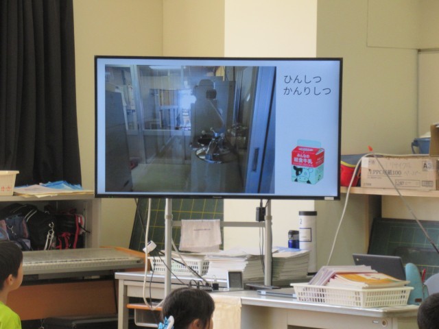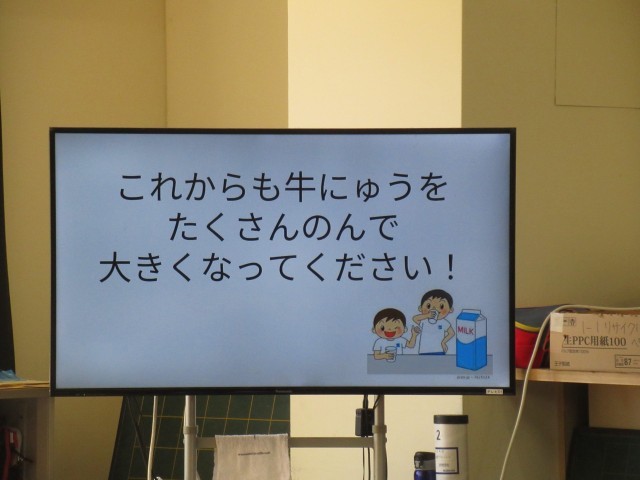 「東毛酪農の秘密を教えます」で始まったスライで、大きく3つについての発表がありました。1つめは、生乳(せいにゅう)について、2つめは、殺菌温度について、3つめは、働く人の工夫でした。写真と説明の文字付きのスライドで、とてもわかりやすく、1年生は興味をもってよく聞いていました。1年生から「牛乳の作り方を教えてください」の質問があると、順序よく説明していた3年生は、とても立派でお見事でした。最後には、3年生から1年生に「牛乳をたくさん飲んで大きくなってください」のメッセージがありました。