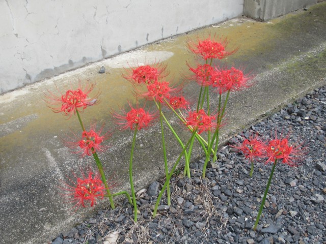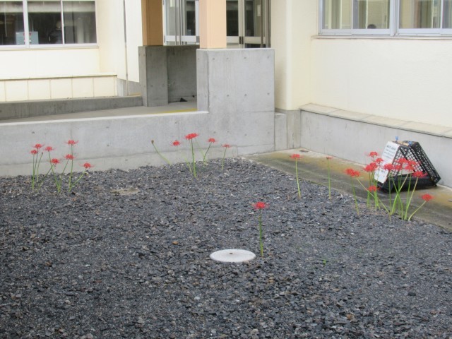 南校舎から給食室への通路の中庭の砂利の中に彼岸花(曼珠沙華)が咲きました。