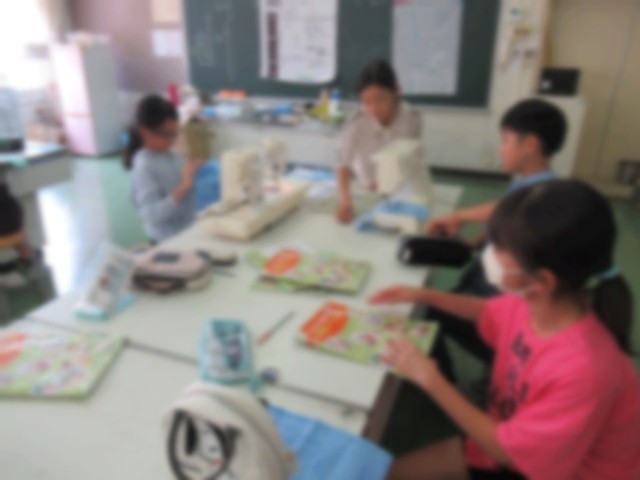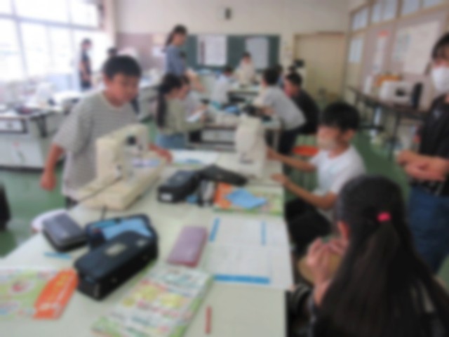 5年生は、家庭科の学習でミシンを使ってエプロン作りに取り組んでいます。1学期に基本的な手縫いの学習をし、2学期は、ミシンやアイロンを使ったエプロン作りです。