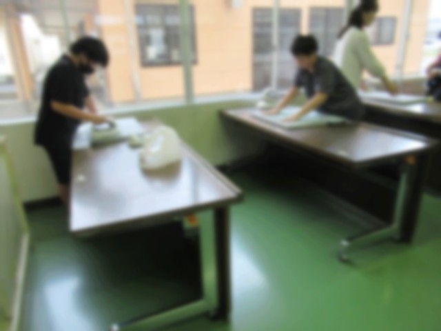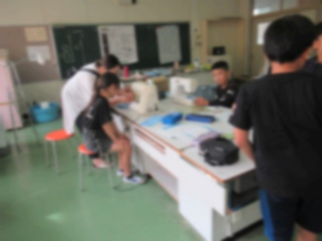 ミシンは、練習布で基本的な縫い方の練習をしてから、エプロン作りに取りかかりました。ミシン縫いをする前には、布の折り返しの部分にアイロンをかけ、しつけ縫いをしてからいよいよミシン縫いです。ミシンは、2~3人程度で1台を交替で使っています。
