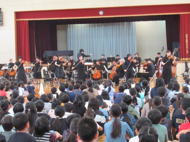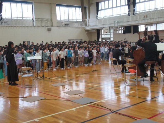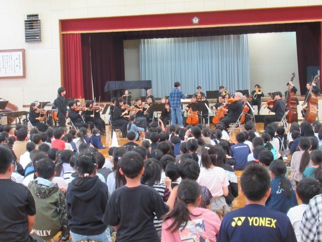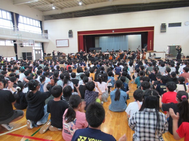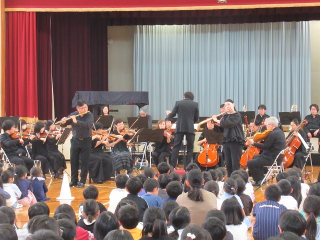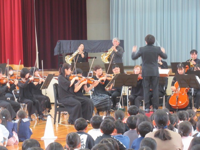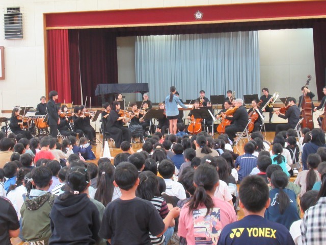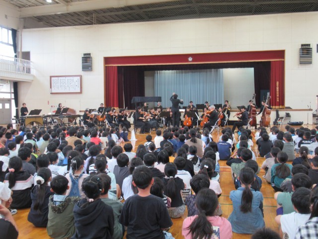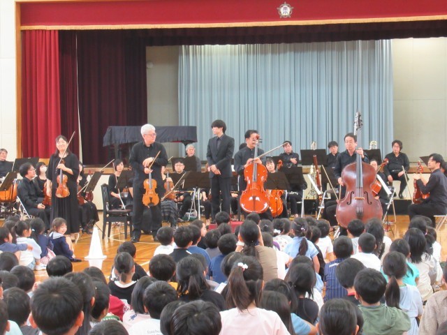 楽器紹介では、木管楽器・弦楽器・打楽器・金管楽器の種類別に計14種類の楽器を紹介していただきました。オーケストラの指揮者体験は代表児童2名でしたが、全校のみんなもタクト(指揮棒)の振り方を練習しました。主な演奏曲は、「威風堂々」「名曲ギャラリー」「カルメン」「ハンガリー舞曲」「君をのせて」「ラデツキー行進曲」等でした。聴いたことのある曲が演奏されると、体を揺らしながら聴く子や思わず口ずさんでしまいそうな子、オーケストラの演奏に釘付けで微動だにせず見て、聴いて、感じている子等がいました。
