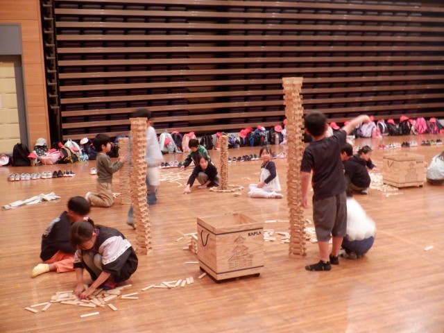 初めに、館内で「カプラブロック」を高く積み上げたり、思い思いの形を作ったりして遊びました。なかには、自分の背丈より高くブロックを積み上げた子もいました。