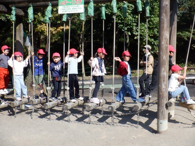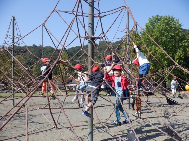 次に、ダイナミック広場で班ごとに仲良く遊具でたくさん遊びました。