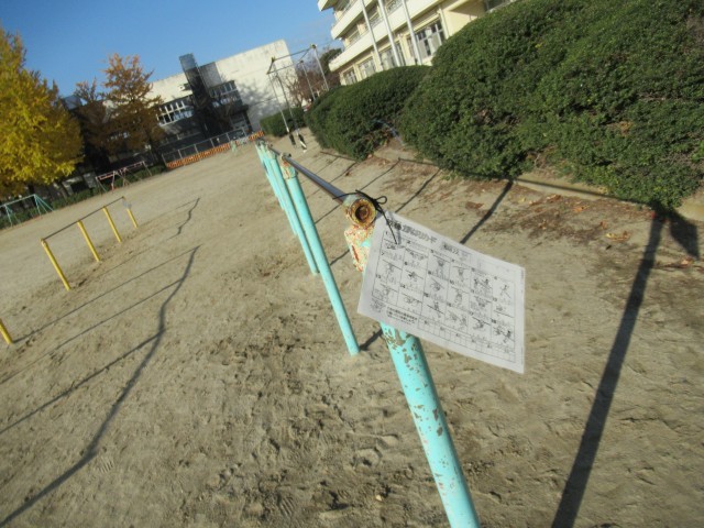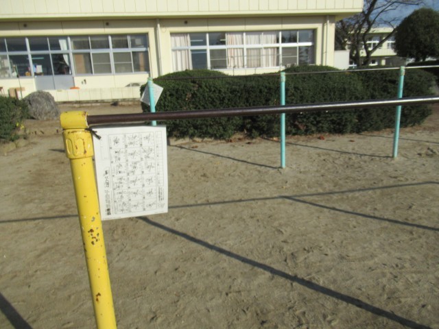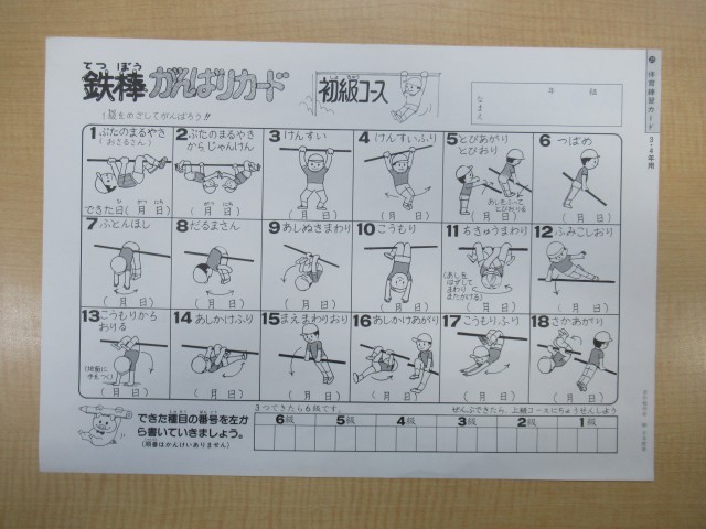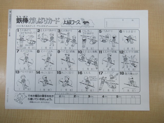 体育委員会の工夫により、鉄棒に「鉄棒がんばりカード」をラミネートしたものが提示されています。表は「初級コース」裏は「上級コース」のカードです。