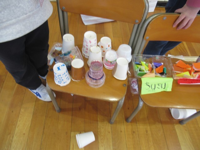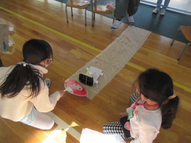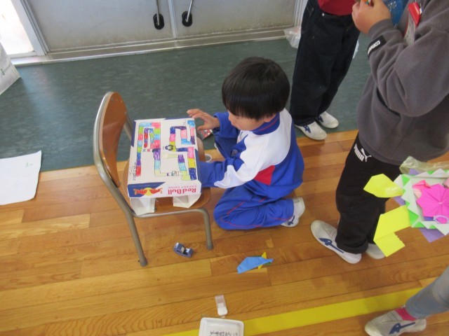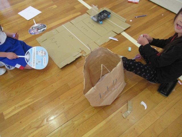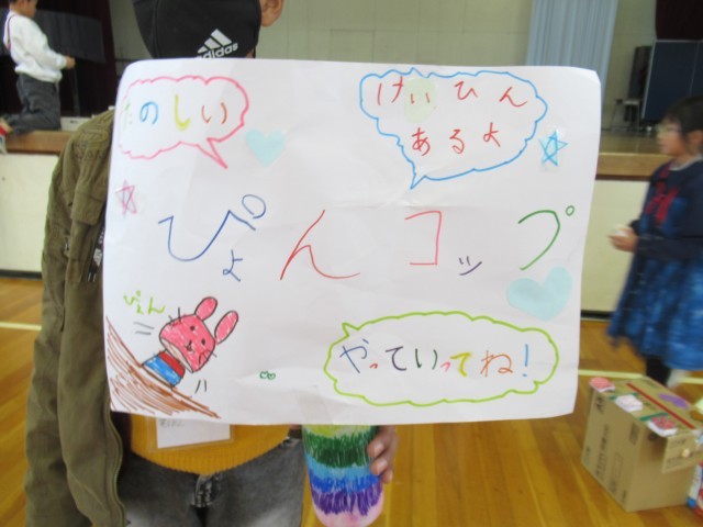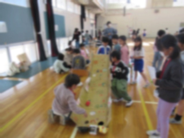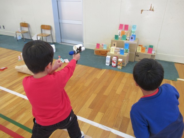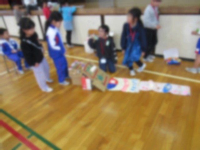 12月18日の3校時は、2年生が1年生を招待して、「おもちゃ大会」を行いました。生活科の「うごく うごく わたしのおもちゃ」の学習の一環です。2年生は、既に2年生同士で互いに作ったおもちゃでおもちゃ屋さんを開き遊びの経験をしてきました。今回は、1年生を体育館に招待しておもちゃ大会を開きました。
