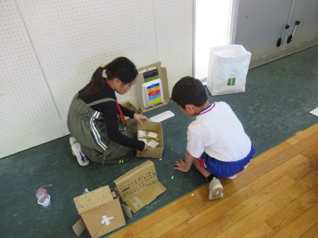 2年生は1年生を優しくリードし、お姉さんお兄さんぶりを発揮しながら遊びを教えていました。1年生は、2年生にリードしてもらいながら、にっこり笑顔で手作りの遊びを楽しんでいました。手作りのおもちゃを通して、1年生と2年生が交流し合い、互いが充実した学びの時間となりました。