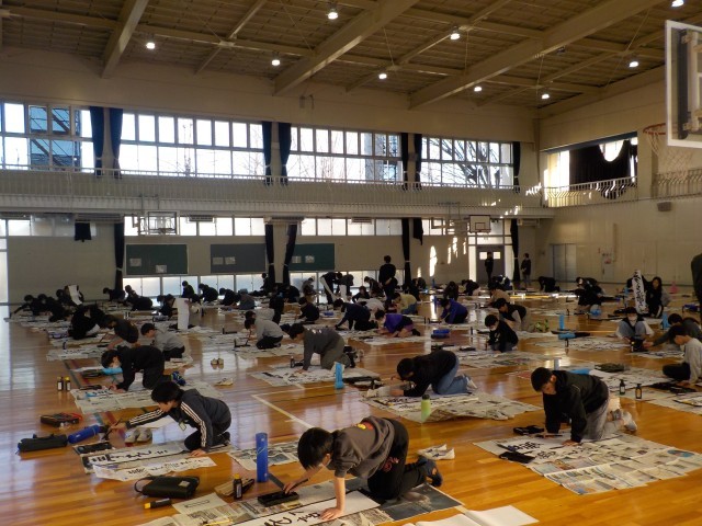 1月9日に、6年生は書き初めに取り組みました。学年合同で体育館で行いました。お題は「夢を語ろう」です。2学期中にも冬休み中にも練習を重ねてきているので、子供たちはポイントを押さえながら真剣に筆を走らせていました。仕上がった作品は、どれも大作です。