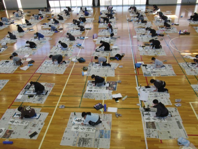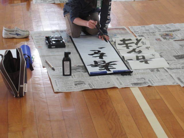 緊張感のある体育館で、筆を走らせる音だけが響いていました。どの子も真剣に力強く