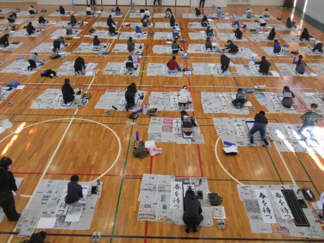 1月14日に、4年生は書き初めに取り組みました。学年合同で体育館で行いました。お題は「春を待つ」です。