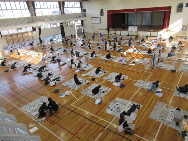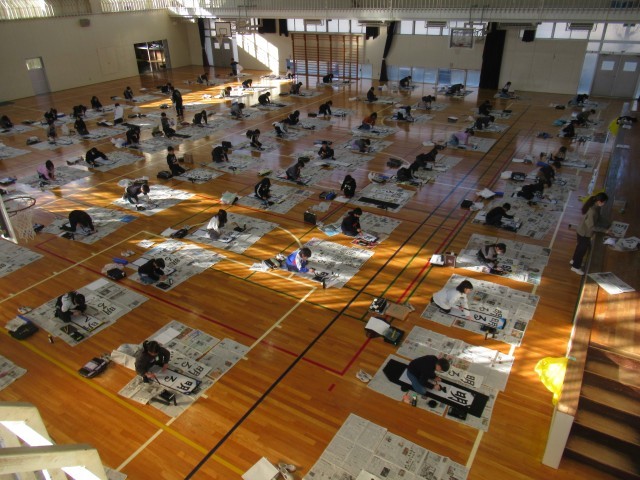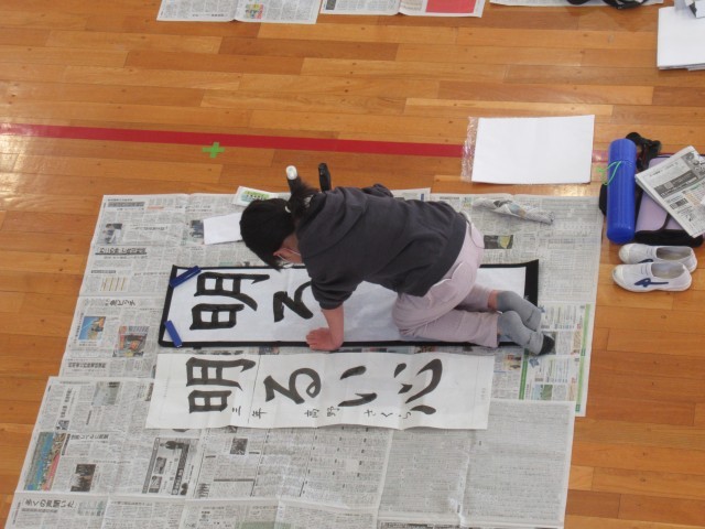 1月15日の1~2校時に、3年生は書き初めに取り組みました。学年合同で、朝の眩しいほどの太陽の光をしっかり取り入れて体育館で行いました。