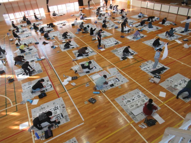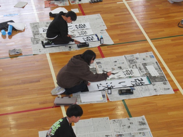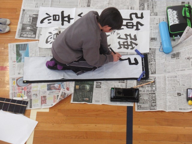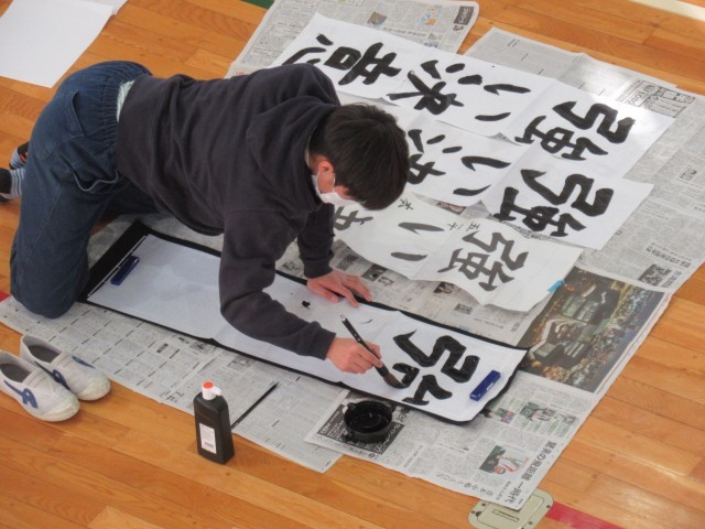 1月15日の5~6校時に、5年生は書き初めに取り組みました。学年合同で体育館で行いました。