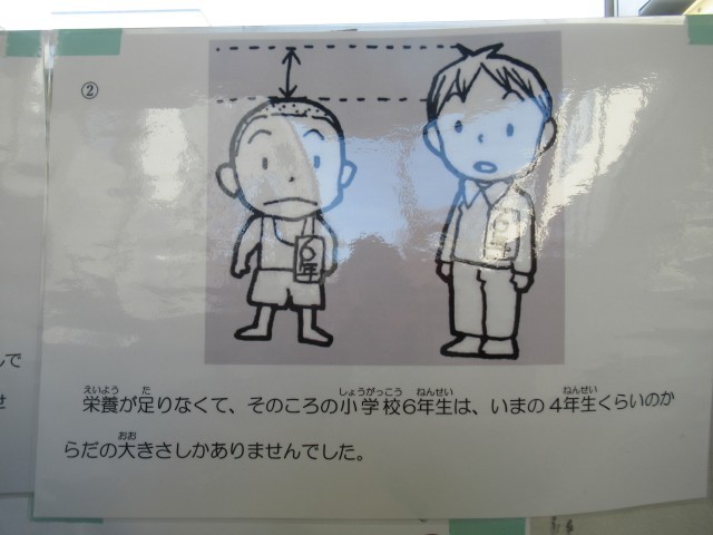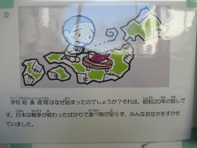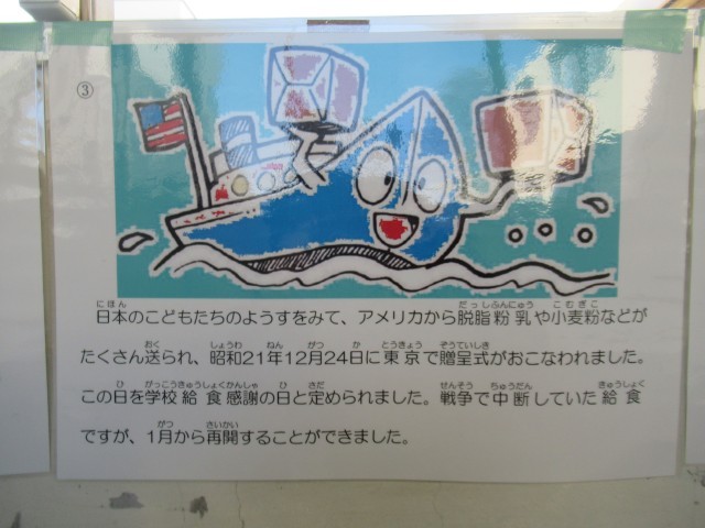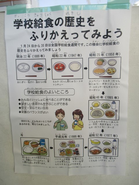 この機会に、給食の歴史について振り返ってみましょう。学校給食の始まりは、明治22年だそうです。栄養士が分かりやすく資料を作成し、給食室前に掲示しました。少し見にくい写真ですが、詳細は、写真を参照してください。
