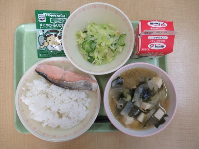 学校給食が始まった頃は、おにぎりや焼き魚、漬物と簡単なものでした。本日は、「給食の始まり」をイメージし、ご飯・ふりかけ・さけの塩焼き・壺漬けあえ・わかめのみそ汁・牛乳の献立でした。