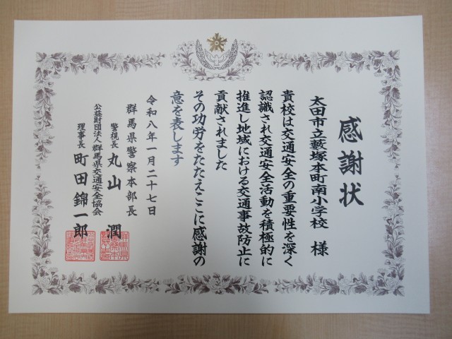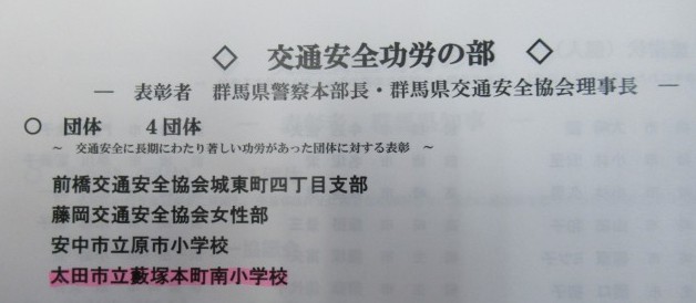 その中で、本校は、交通安全功労の部で表彰されました。賞状には、「交通安全の重要性を深く認識され、交通安全活動を積極的に推進し、地域における交通事故防止に貢献」と記されています。
