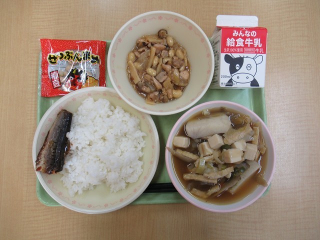 学校では、昨日(2月2日)が一足早く節分献立でした。曜日によってご飯とパンの日の決まりがある関係です。「ご飯・牛乳・いわしの梅煮・鳥と大豆のソテー・けんちん汁・福豆」でした。