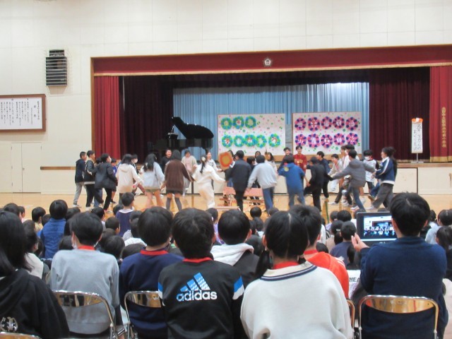 5番目の発表の5年生は、林間学校編と給食編の劇と合唱「明日へつなぐもの」でした。林間学校のキャンプファイヤーでは、6年生も飛び入り参加でマイムマイムを踊りました。揚げパン大人気の給食劇は、大いに盛り上がりました。合唱「明日へつなぐもの」は、6年生からのバトンを引き継ぐ自覚や覚悟が感じられる5年生のパワーあふれる歌声に、みんなが釘付けになりました。