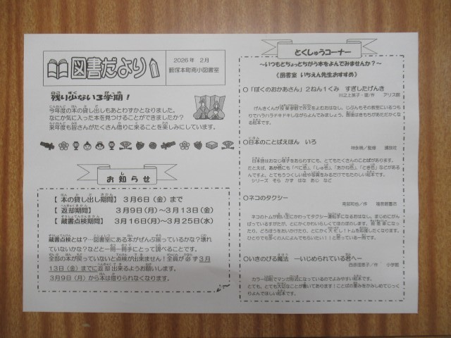 今年度、図書室の本の貸し出しは、3月6日までだそうです。今年度、借りられる期間は残りわずかとなりましたが、たくさんの本と出会い、自分の世界をさらに広げてほしいと思います。