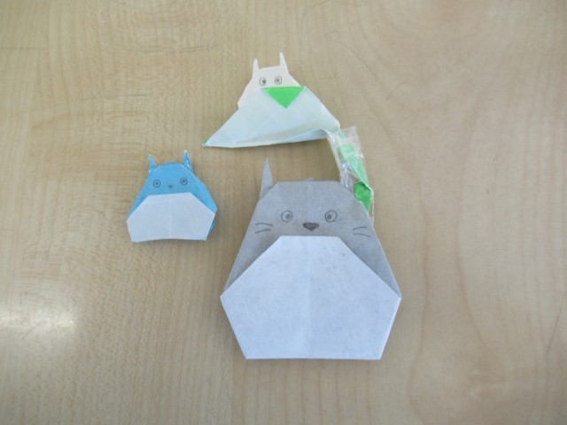 折り紙で作成した「大トトロ・中トトロ・小トトロ」がいつもどこかに隠れんぼをしています。通級にやって来た児童が3つのトトロのかくれ場所を考えて隠れんぼをさせると、次に来た児童が、それを見つけ、さらに違う場所に隠れんぼさせてやるということの繰り返しです。自然と通級教室に行く楽しみができ、トトロの隠れんぼを通した通級児童同士のコミュニケーションにもなっています。