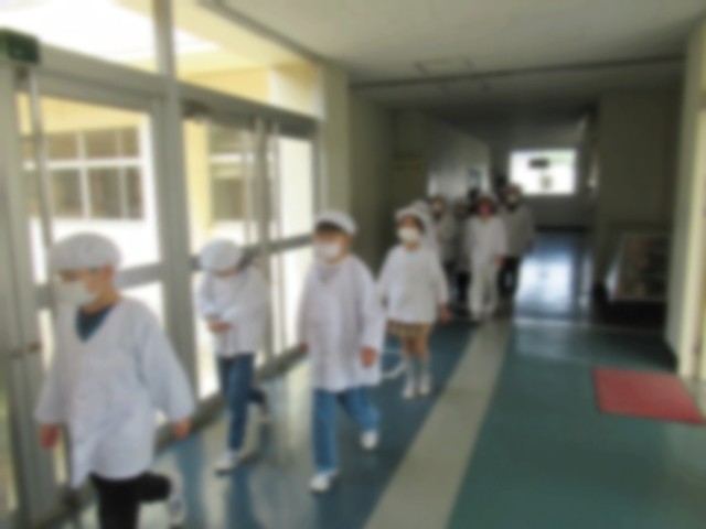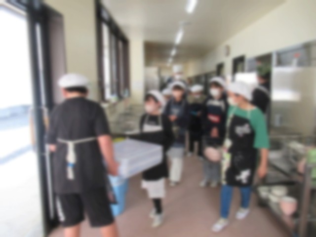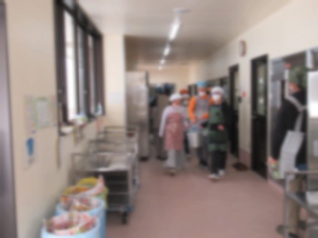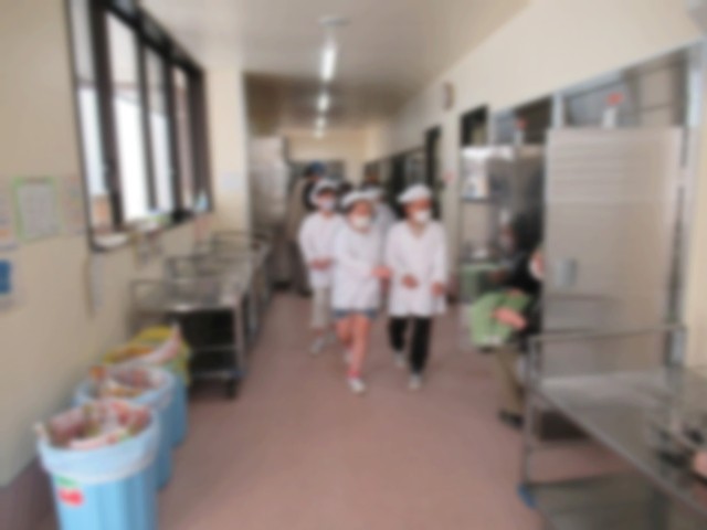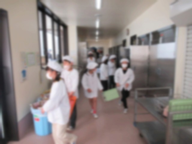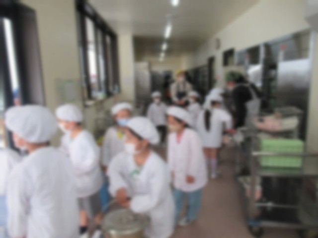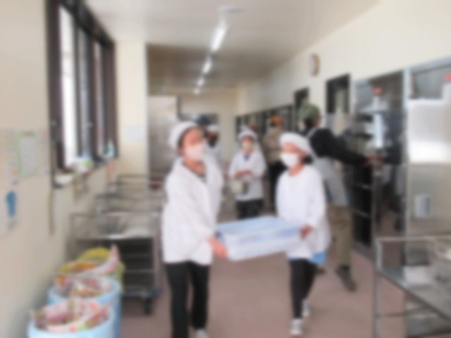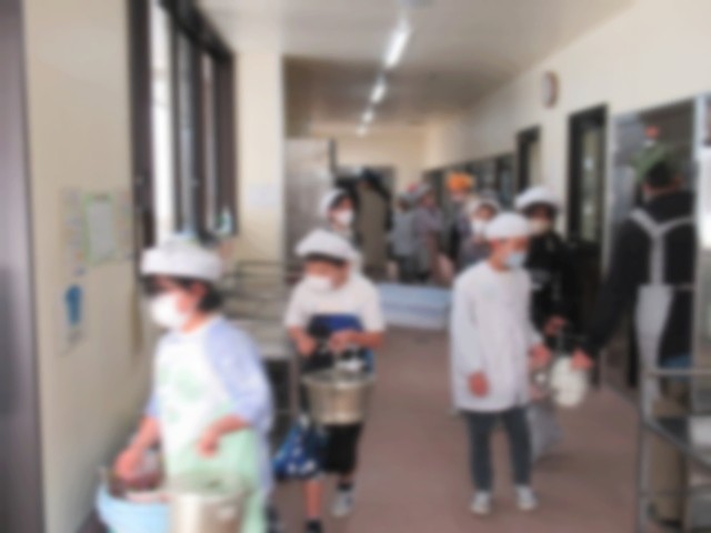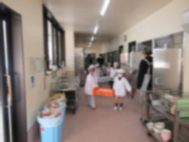 給食室では、職員が給食当番である子供たちに給食の受け渡しをします。給食当番は、慎重に給食を教室まで運び、給食の準備を進めます。