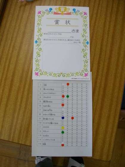 グループ内の友だちのよいところをあげます。一番多く選ばれた項目についてさらに具体的にどのようによいのかを賞状に書いて渡しました。
