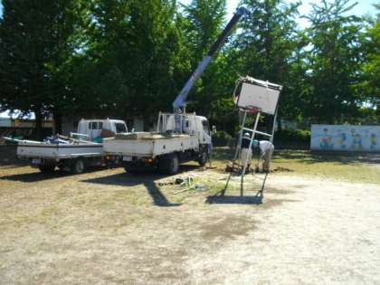 校庭南側のバスケットゴールを撤去しました。 支柱がさびてしまい危険なためです。