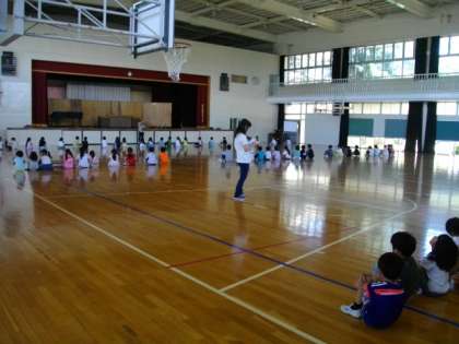 1年生全員が体育館で南幼稚園と一緒に行われる「じゃがいもパーティー」での交流授業の練習をしました。