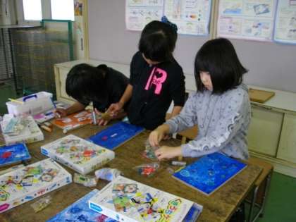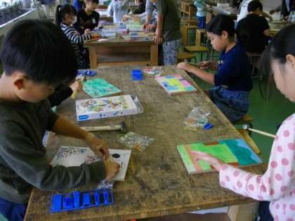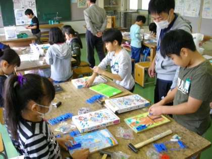図工室でかなづちをつかってくぎ打ちに取り組みました。