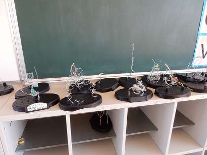 針金を使った作品を作っています。針金を曲げたり、飾りをつけたりして、立体的な作品に仕上げていきます。