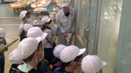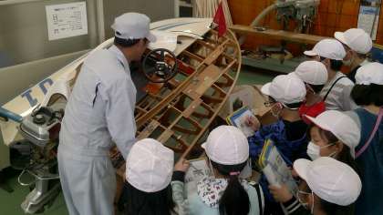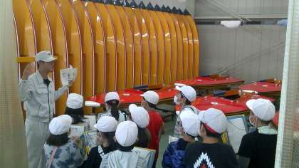 ヤマト発動機では、日本全国の競艇用ボートを全て作っていること、工業用ロボットが作業している工程があることを学び、児童たちはとても驚いた様子でした。