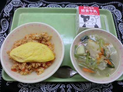 本日はいつものチキンライスにオムレツをのせて「オムライス」のようにしてみました。
