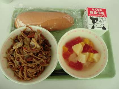 今日は児童に人気の焼きそばです。やきそばは1ヶ月に1回提供しています。来月は太田市の農業政策課が主体となって、太田市産の野菜と群馬県内産の野菜が入ったソースを使った「ソースもまるごとおおたやきそば」を提供予定です。楽しみにしていてください。