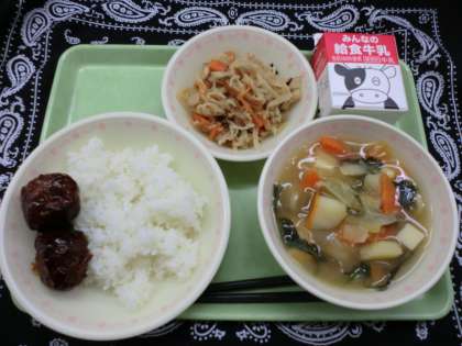 本日は児童に人気の肉団子です。大きな肉団子はとてもボリュームがあり食べ応えがあります。