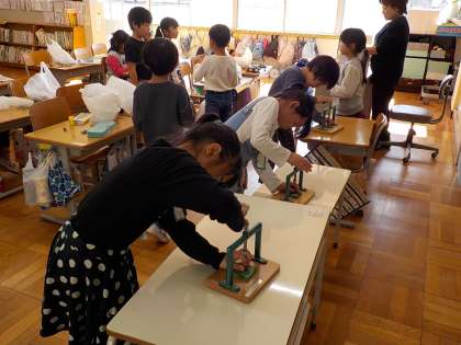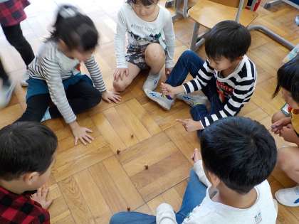 どんぐりごまを作ります。できたこまで、誰が一番長く回っているかの競争をします。